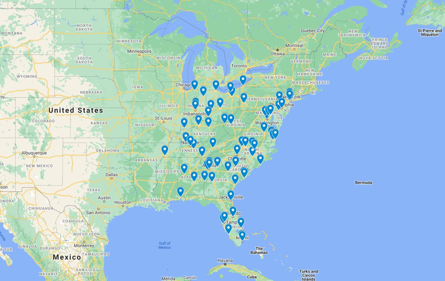 Indiana, North Carolina, South Carolina, Tennessee, Georgia, Alabama, Florida